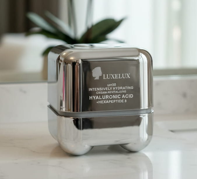 LUXELUX to zaawansowany krem na dzień z filtrem SPF 30. Formuła opiera się na potrójnym kwasie hialuronowym oraz Heksapeptydzie-8, zapewniając intensywne nawilżenie, wygładzenie zmarszczek oraz ochronę przed fotostarzeniem.