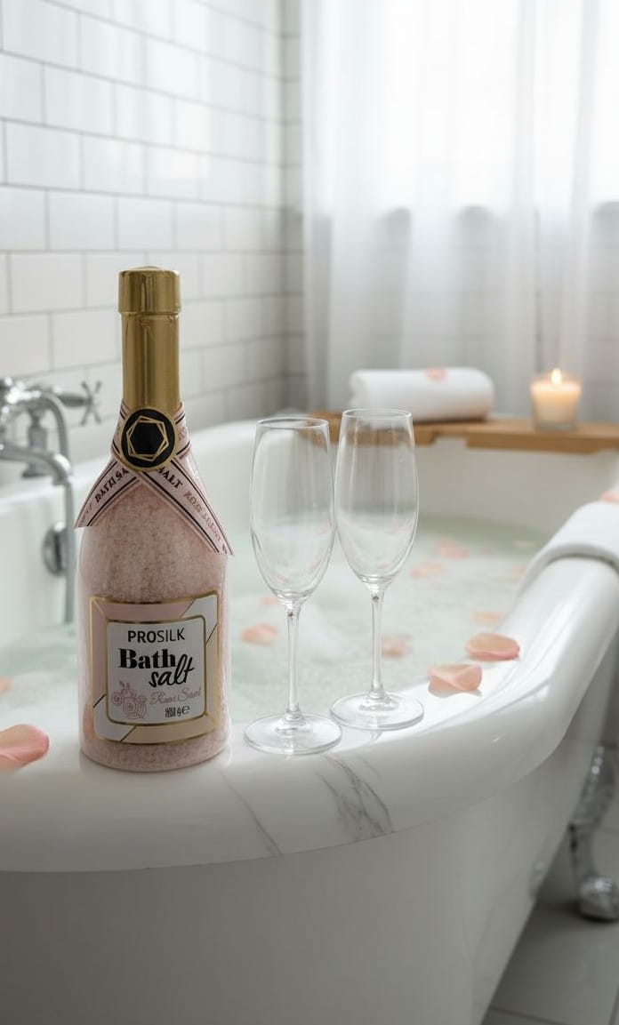 Sól do kąpieli, różany szampan, PROSILK, zapach róży, relaks, pielęgnacja skóry, domowe SPA, luksusowa kąpiel, prezent dla kobiety, aromaterapia, sól mineralna, butelka szampana, romantyczna kąpiel, odprężenie, piękna skóra, kosmetyki do kąpieli, nawilżanie skóry.